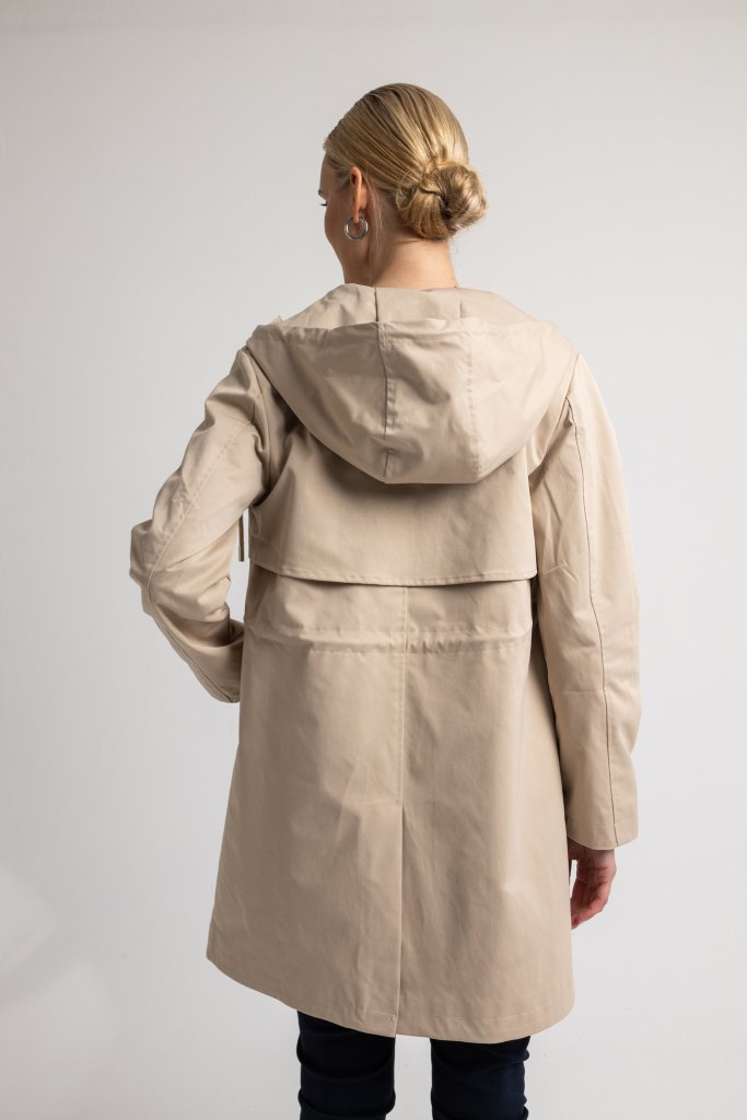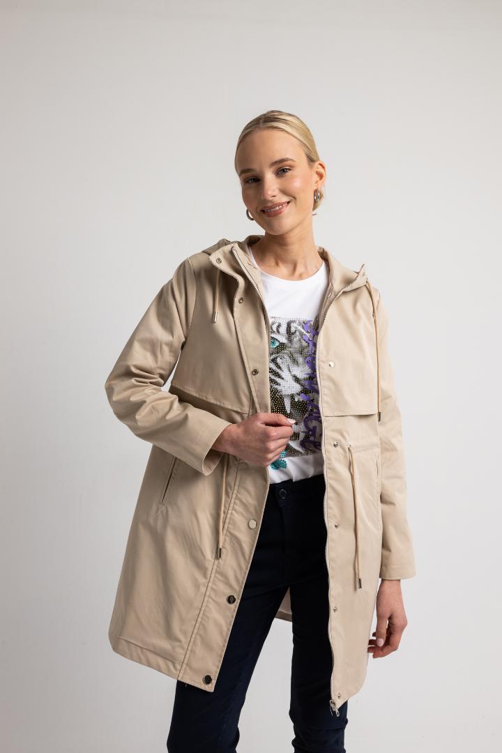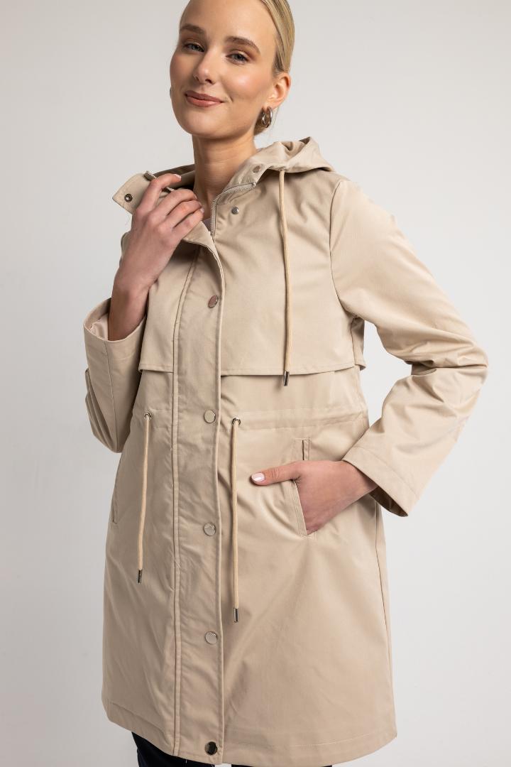 Καπαρντίνα μπεζ με κουκούλα, πάνω από το γόνατο. Κλείνει με φερμουάρ και κουμπιά. Με κορδόνι που σφίγγει για να τονίσει τη μέση, πλαϊνές τσέπες, φοδραρισμένη, άνετη γραμμή. 100% pol.
