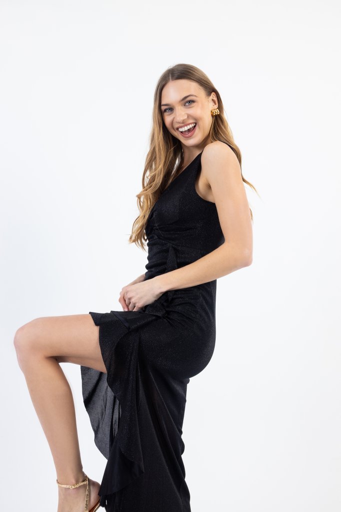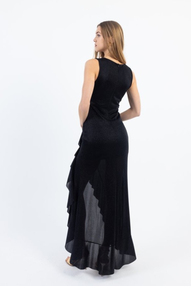 Ένα κομψό και διαχρονικό maxi φόρεμα σε μαύρο χρώμα, σχεδιασμένο για βραδινές και επίσημες εμφανίσεις που απαιτούν δυναμική θηλυκότητα. Η μονόχρωμη γραμμή του αναδεικνύει το σώμα με κομψό τρόπο, ενώ οι ιδιαίτερες λεπτομέρειες προσθέτουν χαρακτήρα και κίνηση.