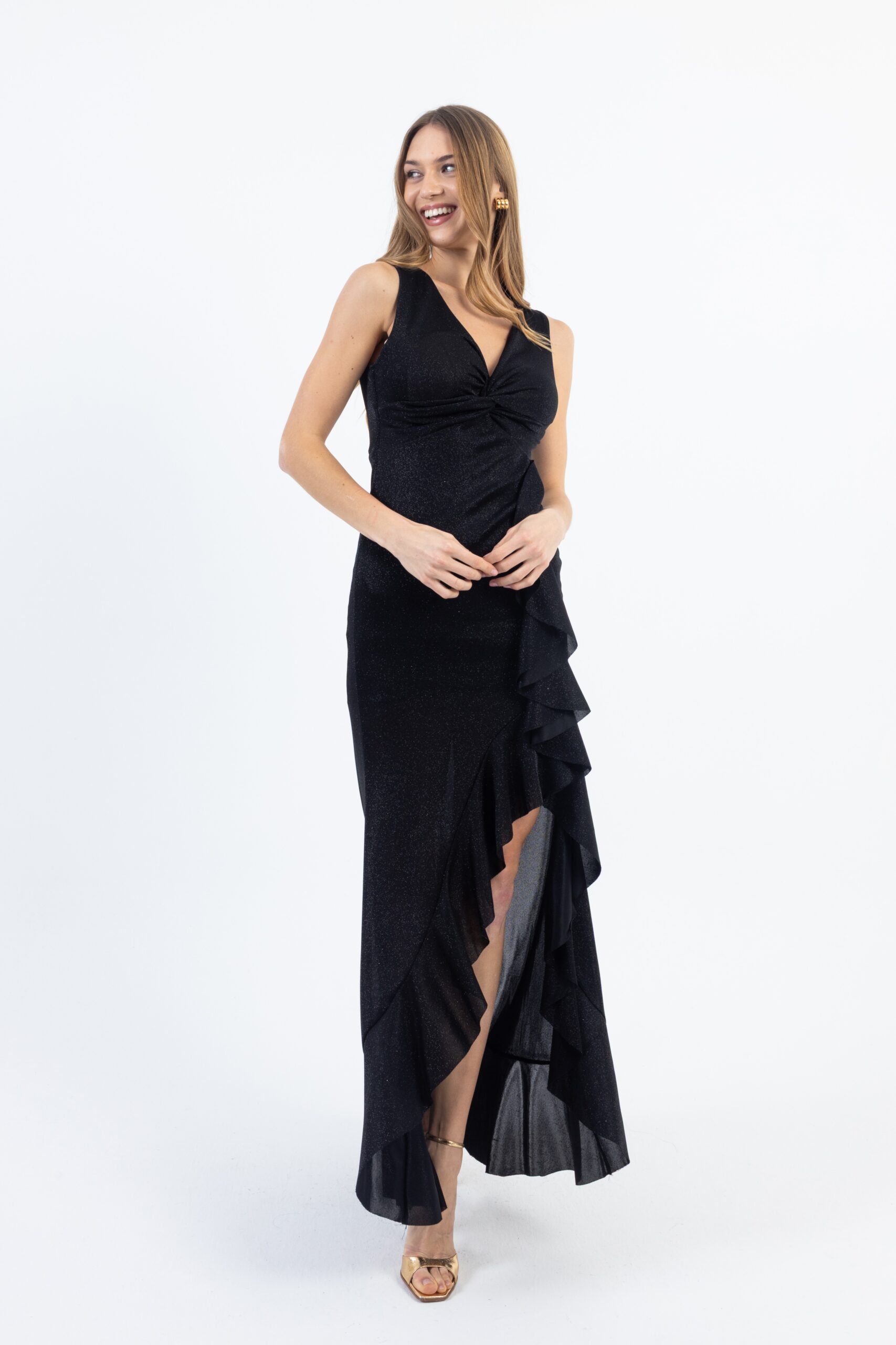 Το μπούστο με V λαιμόκοψη αγκαλιάζει όμορφα το επάνω μέρος, δημιουργώντας κολακευτική εφαρμογή, ενώ η γραμμή στη μέση τονίζει τη σιλουέτα. Στο μπροστινό μέρος διαθέτει εντυπωσιακό άνοιγμα – σκίσιμο, όπως φαίνεται και στην εικόνα, το οποίο αναδεικνύει διακριτικά το πόδι και χαρίζει αισθησιακή αλλά κομψή κίνηση στο περπάτημα. Τα διαδοχικά βολάν κατά μήκος του ασύμμετρου τελειώματος προσθέτουν ροή και ελαφρότητα, κάνοντας το φόρεμα ακόμη πιο εντυπωσιακό.