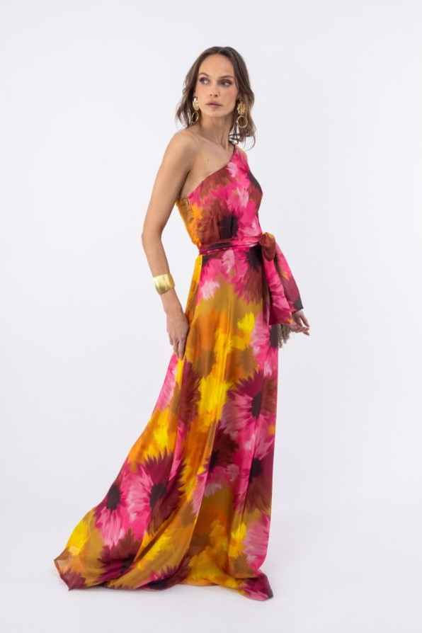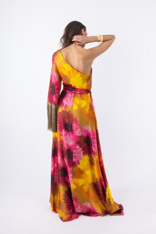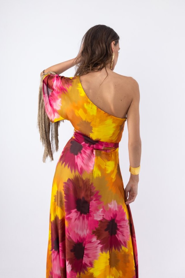 Αέρινο μάξι σατέν φόρεμα, εμπριμέ σε αποχρώσεις ροζ – κίτρινο – σοκολά, με έναν ώμο και κρόσσια στο μανίκι. Ένα εντυπωσιακό σχέδιο με έναν ώμο, που αναδεικνύει διακριτικά το επάνω μέρος του σώματος, ενώ η maxi γραμμή χαρίζει κίνηση και κομψή ροή σε κάθε βήμα. Διαθέτει ζώνη από το ίδιο ύφασμα και έρχεται με τιράντα, που μπορεί να προστεθεί προαιρετικά, φοδραρισμένο, κλείνει με φερμουάρ στο πλάι. 100% pol.