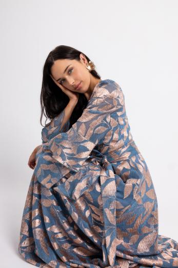 Μάξι φόρεμα σε σιέλ με ροζ χρυσό λούρεξ, κρουαζέ, με ζώνη στη μέση και μακρύ μανίκι με διπλό βολάν. Βαρύ ύφασμα, με υπέροχη ελαστικότητα, που δε διαγράφει και τέλεια εφαρμογή. Φοδραρισμένο όλο, κλείνει με κρυφό φερμουάρ πίσω. 55% pol, 45% mc. Μία πρωτότυπη επιλογή σε βραδινό φόρεμα, για να ξεχωρίσεις σε γάμο ή βάπτιση.